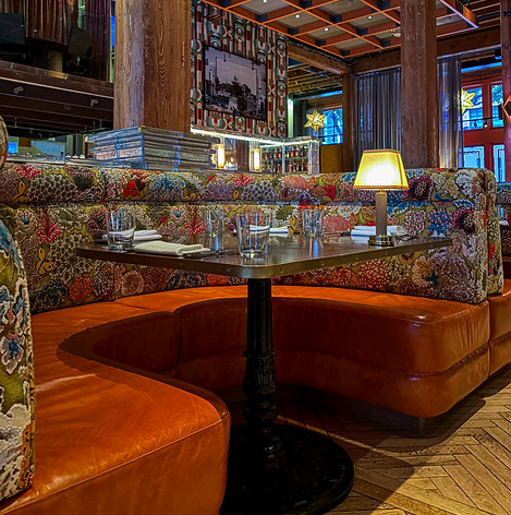 Playing with light and drama, this intimate nook features interlocking rectangles of colorful glass, partitioned by boundaries of brass. As you perch at the bar to order a drink, notice how the light softly colors everyone and everything inside with a palette of rich sapphire, jewel tones, and polished metal.